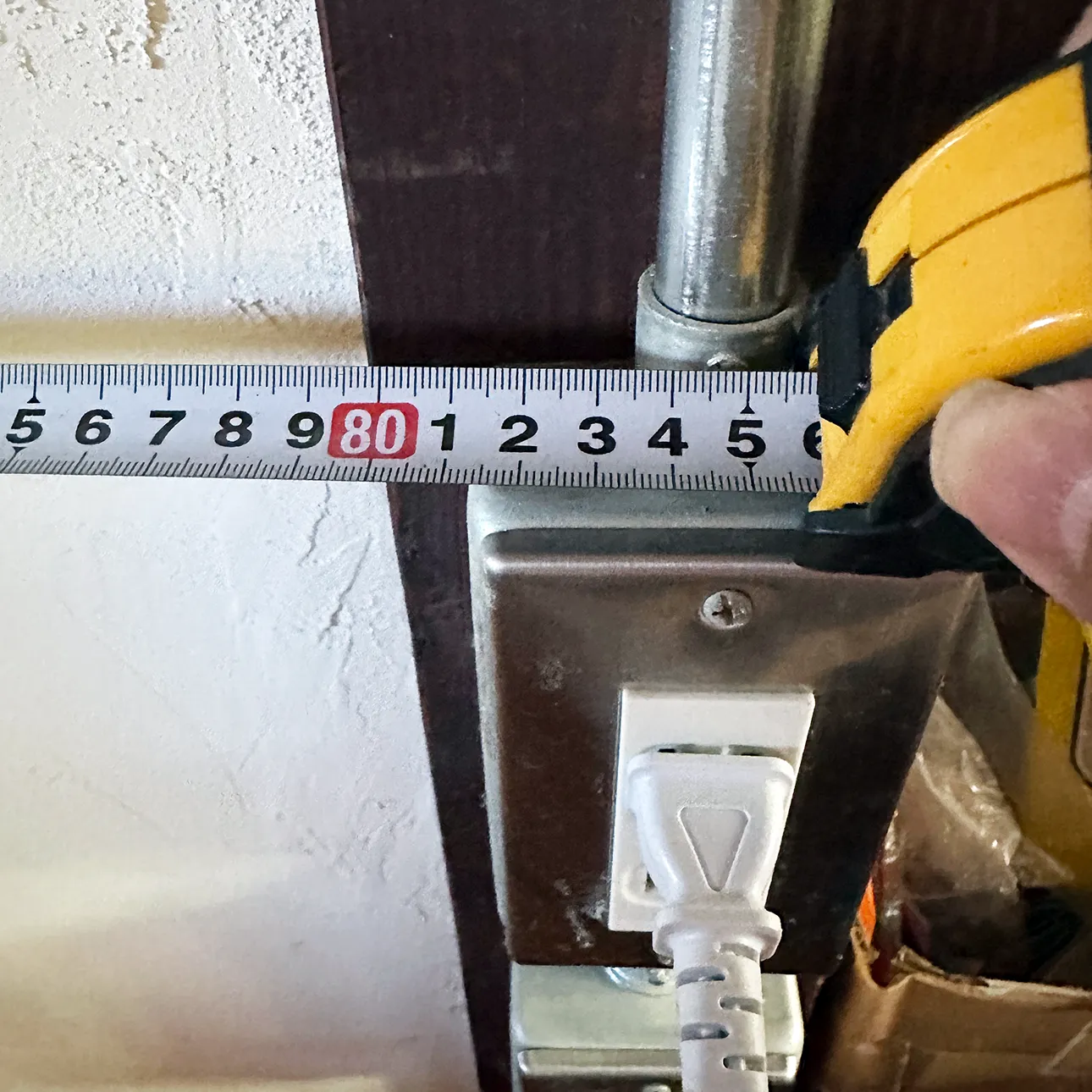 この銀色のパイプはコンセントの配線カバーなんですが、ここに当たってしまうと棚と壁の間にスペースができてしまって、そこに子供たちの絶対提出しないといけないプリントとかお気に入りの定規とか脱ぎっぱなしになってた靴下の片方とかが無限に吸い込まれることが分かっていたので、ぴったりと壁に押し当てる必要があったのですが、これだとバッチリ入ります。