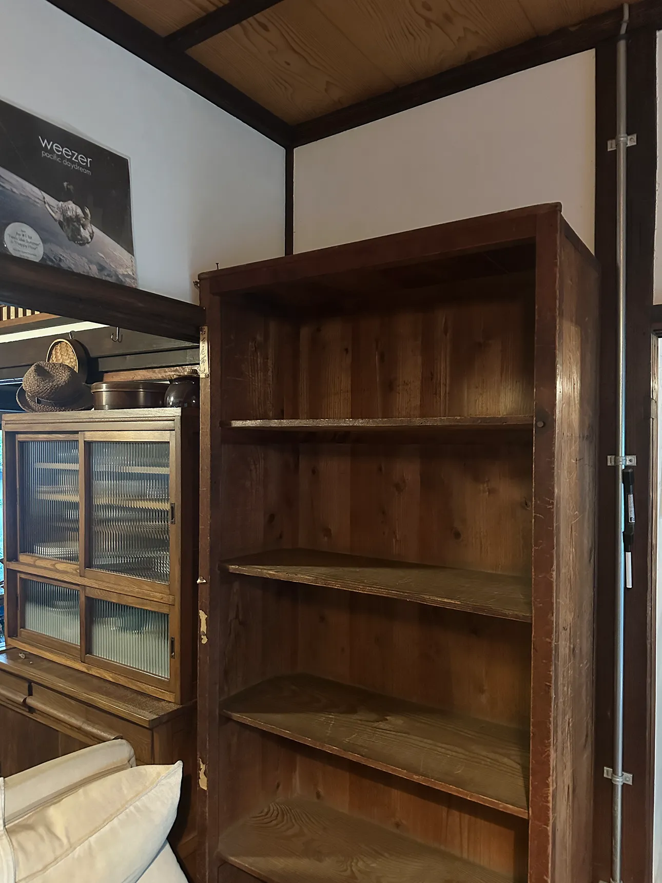 という流れで、納戸に入れっぱなしになっているでっかい木製の棚を本棚にして、居間のこの場所に置こうと思い立ったのでした。